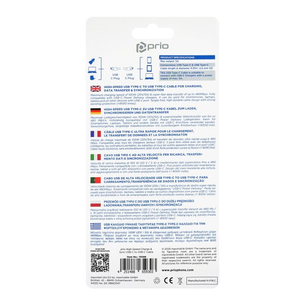prio USB C til USB C-kabel med høj hastighedsopladning og synkronisering 5A 0,25 m hvid