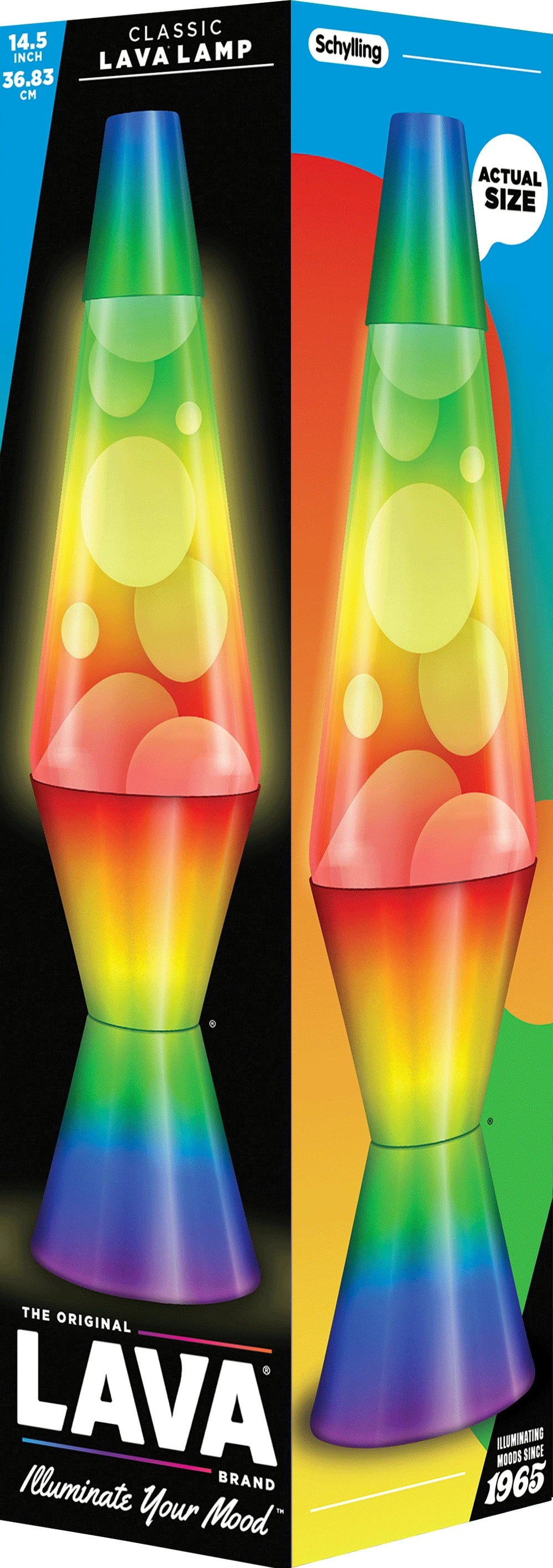 Farveskema: Lampen har en slående hvid voks, der danser gennem en trefarvet væske og skaber en fascinerende opvisning af bevægelse og farver. Foden, en levende regnbuefarve, tilføjer et legende, men sofistikeret touch til det overordnede design.