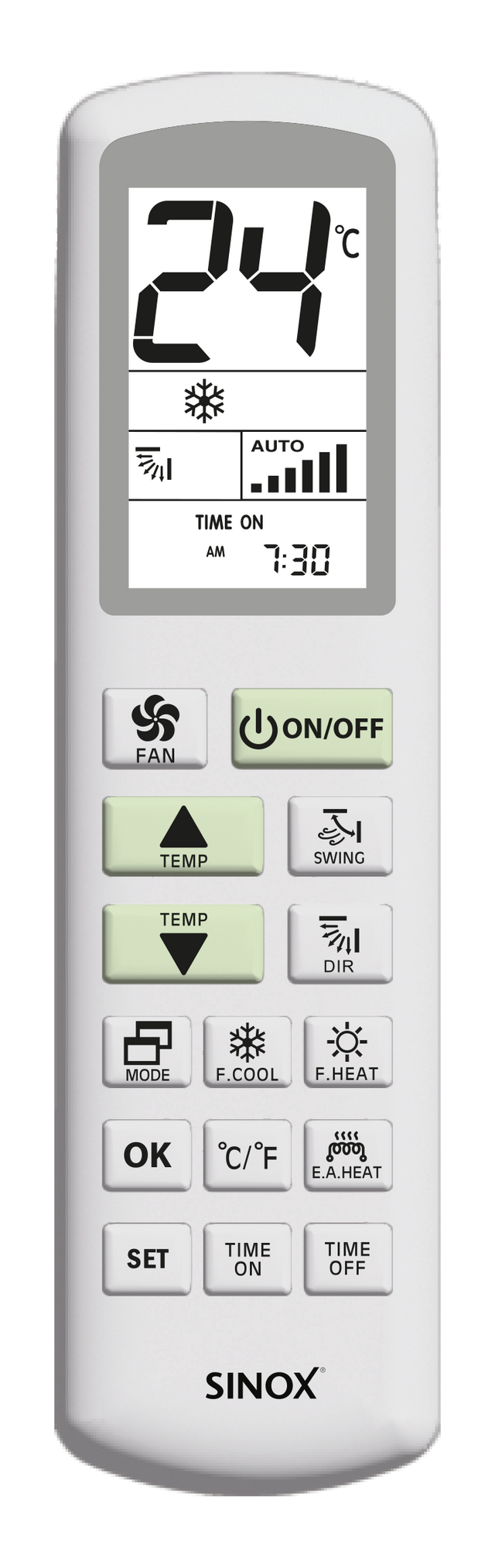 Sinox SXR2070 er en erstatningsfjernbetjening til Toshiba, Panasonic, LG, Mitsubishi og mange flere klimaanlæg.