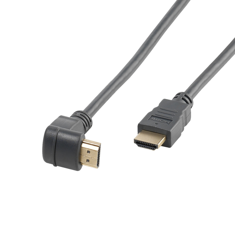 Højhastigheds-HDMI-kabel med Ethernet, med et 90° vinklet HDMI-stik til praktiske og pladsbesparende installationer. Understøtter HDMI Ethernet Channel (HEC) op til 100 Mbps, Audio Return Channel (ARC), 1080p 3D-skærm i Dual Stream-tilstand og 4K-opløsning op til 4096 x 2160 pixel ved 24 Hz. Overførselshastigheder på over 10 Gbps. 24-karat guldbelagte kontakter giver en stabil og langvarig forbindelse.