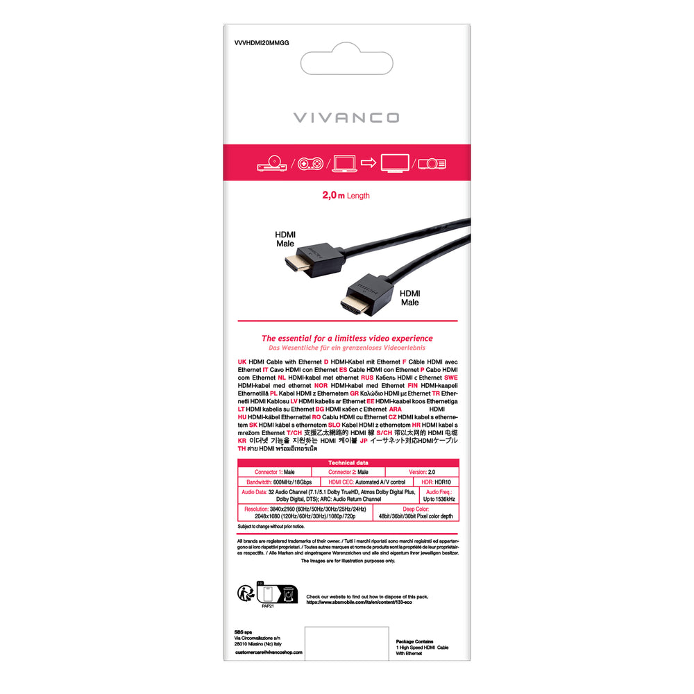 HDMI-kablet giver mulighed for high-definition audio-videoforbindelser mellem enheder, der er udstyret med denne port, f.eks. den nyeste generation af tv'er, Blu-ray-afspillere og videospilkonsoller. HDMI 2.0-standarden understøtter op til 4K-opløsning (60fps), og guldbelagte stik sikrer fremragende signalkvalitet.