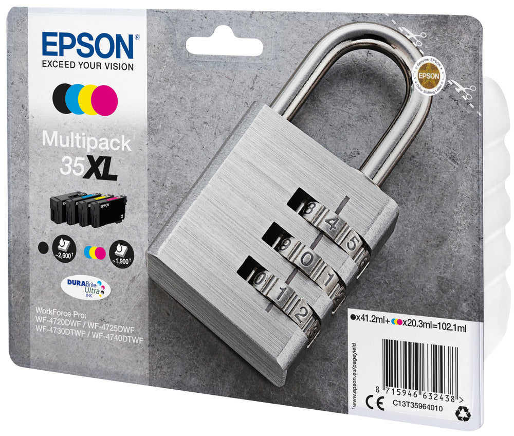 Epson Padlock C13T35964010. Patron kapacitet: Højt (XL) udbytte, Sort blæk type: Pigmentbaseret blæk, Sort blæk volumen: 41,2 ml, Forsyningstype: Multipakke, Farve blæk volumen: 20,3 ml, Udskrivning af farver: Sort, Blå, Magenta, Gul, Antal pr. pakke: 1 stk