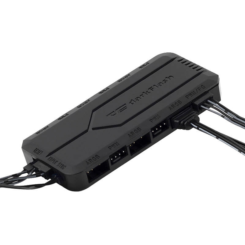 The Darkflash PWM controller module is equipped with several ARGB and PWM ports. It supports up to 14 lighting effects and can be synchronized with the motherboard. It allows you to control the temperature and the fan speed. It is also user-friendly and extremely durable.