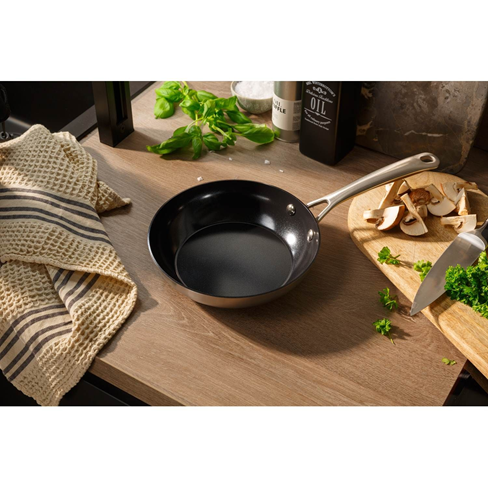 Stegepanden er lavet i 18/0 stål med en elegant børstet overflade, som giver både holdbarhed og et stilrent look. Med en 2,5 mm induktionsbund og 2,5 mm vægge samt to lag KFCC G7 keramisk non-stick belægning sikrer det, at maden ikke sætter sig fast, og at stegepanden er nem at rengøre.