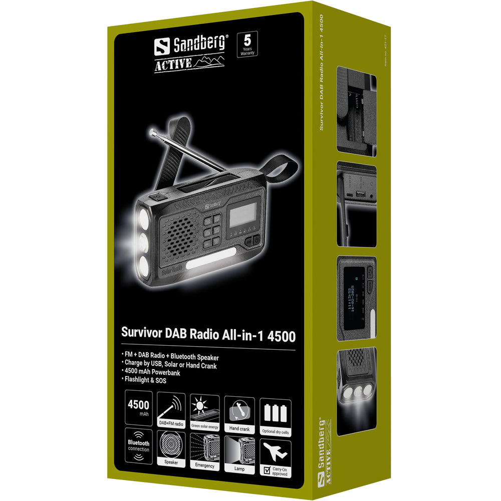 Sandberg Survivor DAB Radio All-in-1 4500 er en kompakt og robust enhed, der samler flere funktioner i ét. Uanset om du er på eventyr i naturen eller står i en nødsituation, har du alt, du behøver. Den er både en powerbank til opladning af din smartphone, en Bluetooth-højttaler til musikstreaming fra din telefon, og en radio med DAB og FM modtagelse. Med indbygget solpanel og drejehåndtag kan du oplade, når strømmen er væk, og du kan også bruge AAA-batterier som alternativ. Desuden får du lys som både lygte og læselampe. Sandberg Survivor DAB Radio All-in-1 4500 er klar til enhver situation.