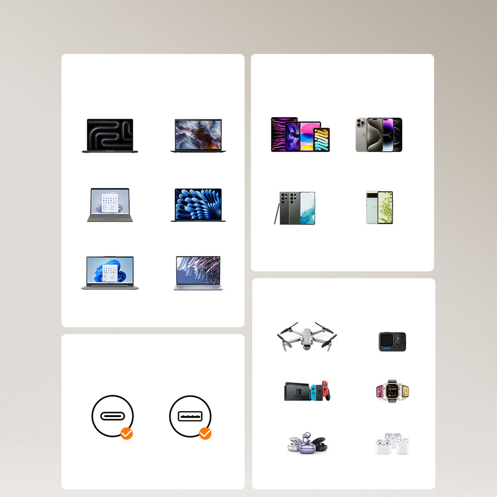- Es ermöglicht das schnelle Aufladen einer Vielzahl von Geräten, was die Vielseitigkeit erhöht . Kompatibel mit Telefonen, Tablets, DJI-Drohnen, GoPro, Nintendo Switch-Konsole, Apple Watches, AirPods und Samsung Galaxy Buds.