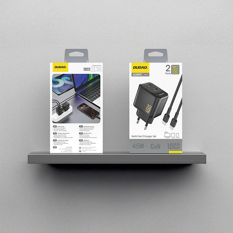 Dudao A28PCEU PD 45W GaN 2xUSB-C Wall Charger med USB-C-kabel - sort