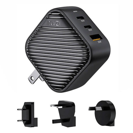 INVZI GanHub 2x USB-C + USB vægoplader, 65W, EU/UK/AU/US (sort)