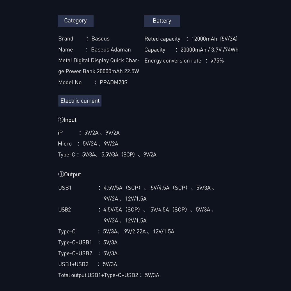 - Capacity: 20000mAh / 3.7V / 74Wh