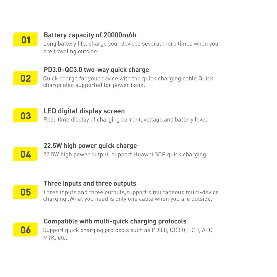 Powerbank marki Baseus obsługuje wiele standardów szybkiego ładowania m.in. SCP, Quick Charge 3.0, Power Delivery 3.0. Ma wbudowane 2 wyjściowe porty USB-A, port wejściowo-wyjściowy USB-C oraz porty wejściowe Lightning i Micro-USB. Produkt obsługuje prąd wyjściowy o maksymalnej mocy 22.5W. Ekran LED, który znajduje się na jego obudowie wskazuje wartość prądu z jaką aktualnie pracuje oraz poziom naładowania akumulatorów. Układ scalony obsługuje wiele zabezpieczeń, które chronią podłączone urządzenia przed uszkodzeniem.
