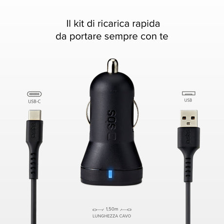 SBS USB C biloplader kit. 1A + 2.1A. 1m. Sort