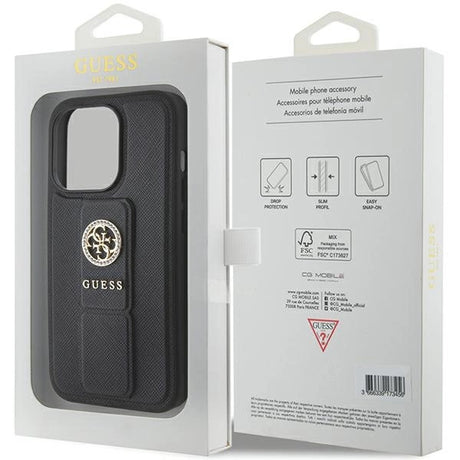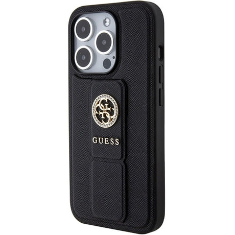 Guess Grip Stand 4G Saffiano Strass fodtøj til iPhone 15 Pro Max - sort