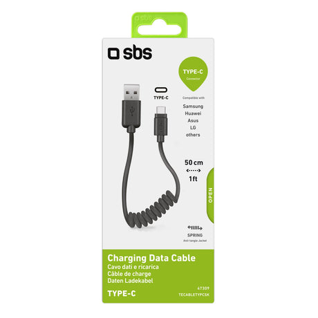 SBS data- og opladning spiralkabel USB 2.0 - USB C. 17-50cm. Sort