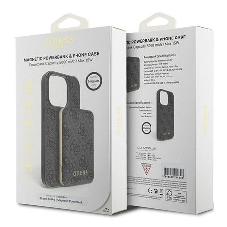 Guess 4G Metal Logo-kasset til iPhone 14 Pro + 5000mAh MagSafe powerbank - sort