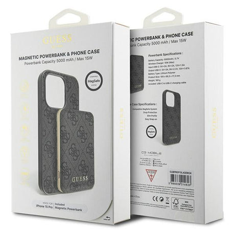 Guess 4G Metal Logo-kasset til iPhone 15 Pro + 5000mAh MagSafe powerbank - brun