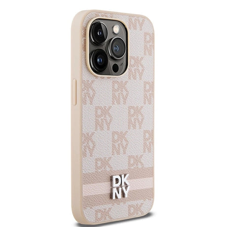 Læder fra DKNY med krydsede mono mønstre og trykte striber til iPhone 15 Pro - pink