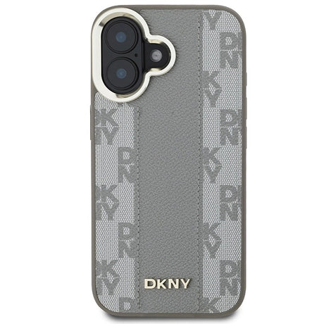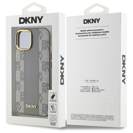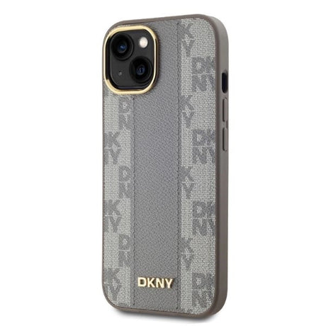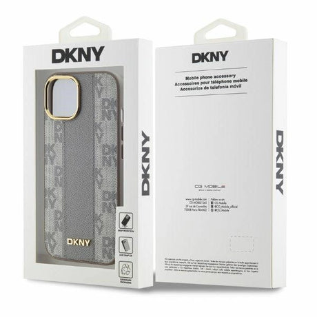 MagSafe iPhone 15 Plus-kasse af DKNY læder med krydsede mono mønstre - beige