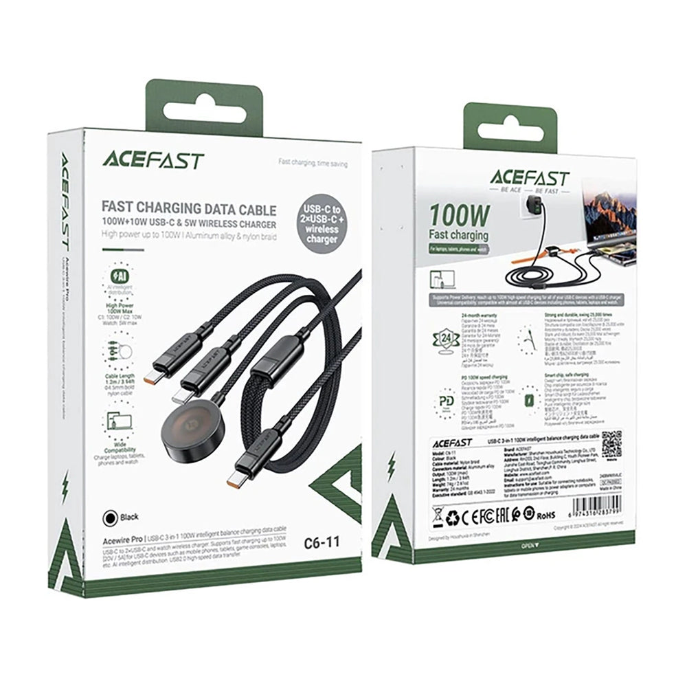 The 3in1 Acefast C6-11 cable is an innovative solution for those looking for a reliable, versatile and fast charging and data transfer cable. With support for 100W fast charging and 480Mb/s data transfer, it is the perfect choice for today's mobile devices. Whether you are charging your phone, tablet or using the wireless charging technology of the Apple watch, the Acefast C6-11 cable ensures reliability and speed. With an external material resistant to damage and very flexible, it is a product that serves for a long time. Choose the Acefast C6-11 and enjoy a modern solution that will meet all your technological needs.