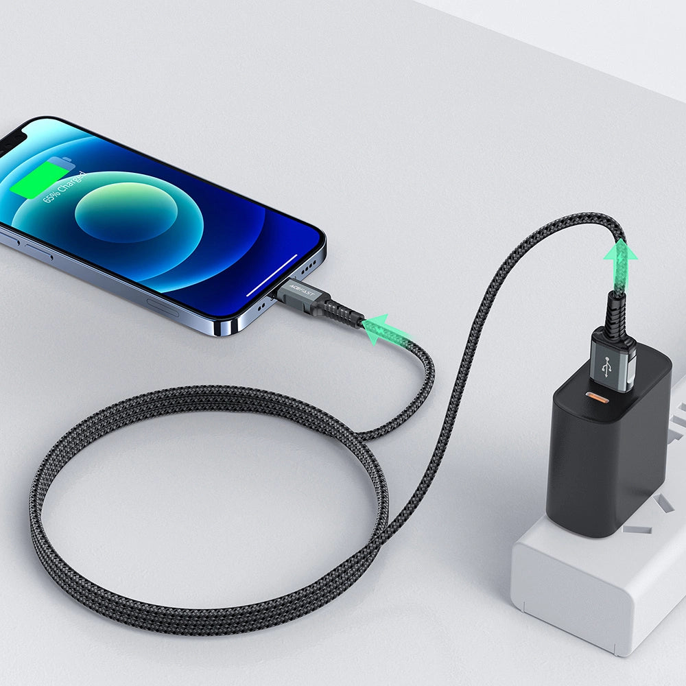 Acefast USB - Lightning cable for charging and data transfer. It is designed for Apple devices with a Lightning connector. It has a length of 120 cm and is adapted to work with a current of up to 2.4 A. It has the MFI (Maide For iPhone) certificate, thanks to which the phone will not display a message about a non-original accessory. The cable is braided along its entire length with nylon. The plugs have an aluminum housing. The cable ends are protected against damage at the most frequent bending points.