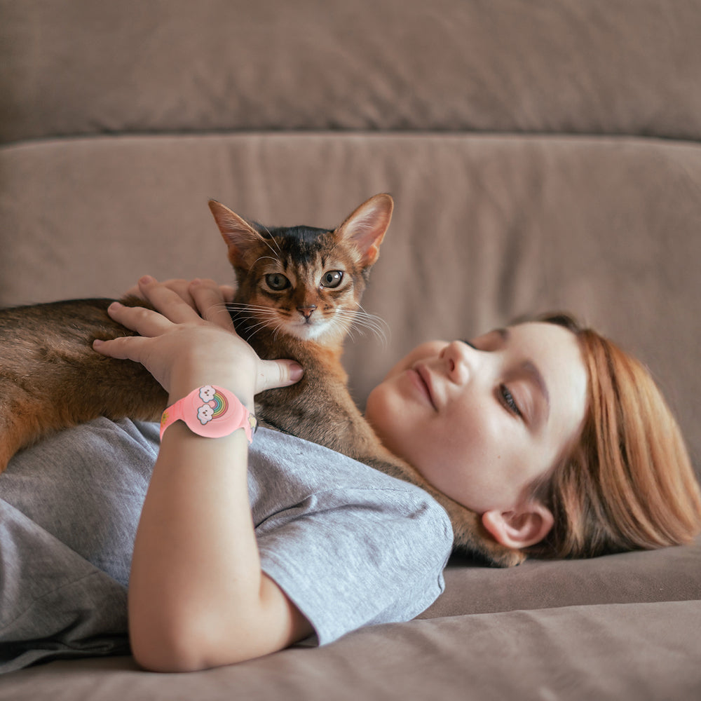 This pink rainbow-themed wristband is a practical and charming AirTag case that allows you to track your child's location safely and conveniently. Made of soft, flexible silicone, it fits perfectly on the wrist, ensuring all-day comfort. The waterproof cover protects the tracker from damage and dirt, and the colorful design makes it a joy for your child to wear every day. It's a functional accessory that combines safety and fun in one.