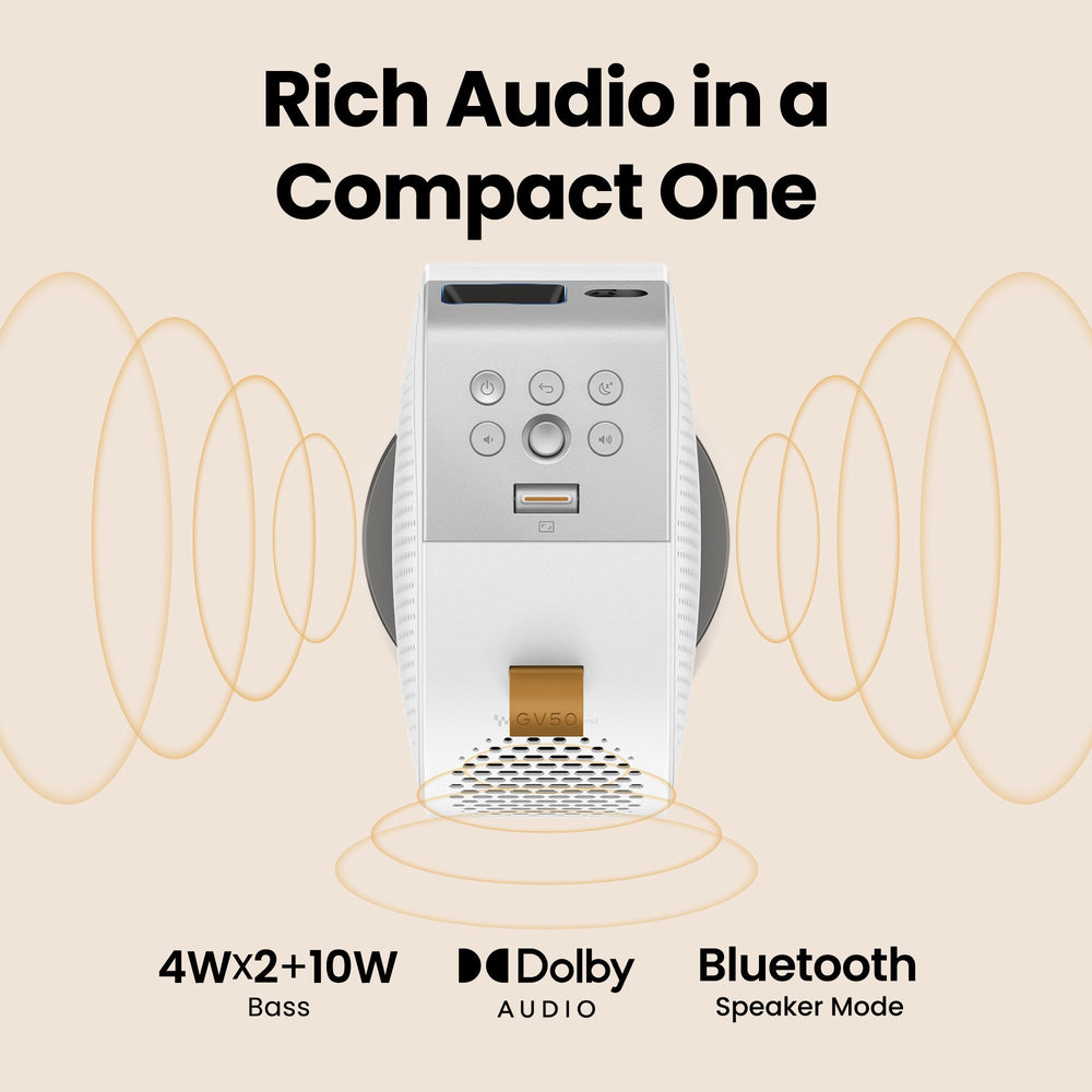 BenQ GV50. Projektor lysstyrke: 500 ANSI lumens, Projektionsteknologi: DLP, Projektor indbygget opløsning: 1080p (1920x1080). Lyskilde type: Laser, Levetid for lyskilde: 20000 t, Levetid for lyskilde (økonomisk tilstand): 30000 t. Fokus: Automatisk, Zoom type: Fastgjort, Forskydning: 100%. Farvetilstande for video: Lys biograf, Biograf, Brugerdefineret, Spil, Nat. HDMI-version: 2.0b