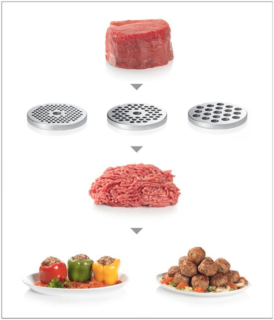 Stærk motor med høj blokeringsevne afbryder strømmen: Giver jævnt bearbejdet kød på kortest mulig tid|Hurtig maling på 3 kg./min|Bak funktion: Den sikre måde at løsne madvarer der har sat sig fast|Pølsehorn: Den nemme vej til hjemmelavede pølser|Kebbe tilbehør: For nem tilberedning af den lækre traditionelle ret
