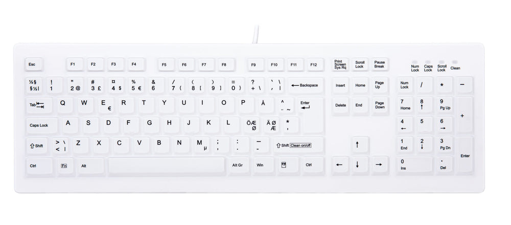 CHERRY AK-C8100F-UVS-W/NOR. Tastatur stil: Lige. Forbindelsesteknologi: Ledningsført, Enhedsgrænseflade: USB, Tastatur nøglekontakt: Membran, Tastaturopsætning: QWERTY, Antal taster på tastatur: 105, Anbefalet brug: Medicinsk. Produktfarve: Hvid