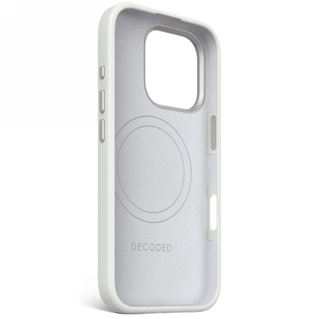 DECODED IS A TIMELESS DESIGN Decoded creates luxury accessories for mobile devices that stand out with a harmonious combination of classic design and advanced functionality. Each Decoded case is finished with delicate accents that give it a unique look. PROTECTION IN GOOD STYLE The Decoded case is made of high-quality liquid silicone, characterized by a silky smooth finish. The use of such a material enhances the color of the case, which becomes a unique style accent. ABSORBS SHOCKS The apparent delicacy of silicone in reality shows resistance to the effects of impacts and provides the perfect combination of lightweight design with complete protection of the iPhone. The internal structure of the case effectively absorbs the force of impact, so that when the phone falls in the case, the device remains intact. The case is made of silicone with antibacterial properties. NO SCRATCHES Put and move your phone without worries on a desk, table or other flat surface. The case has a two-layer, anodized, metal ring around the camera, thanks to which the lenses are protected from scratches. MAGSAFE AND WIRELESS CHARGING Thanks to the magnetic module built into the case, it is compatible with the MagSafe functionality, and with most wireless chargers. The case ensures precise positioning of the phone at the charging point on the MagSafe wireless charger. Just place the phone on the charger matrix, and both devices will fit together perfectly, providing stable charging.