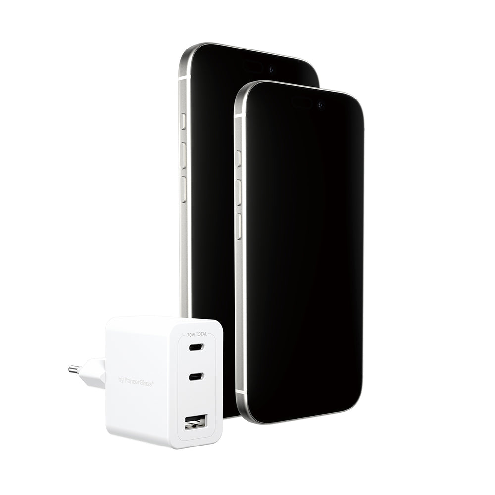 PanzerGlass empower by ® Turbo 70W Multiple Oplader inkl. 2 x USB-C + USB-A | EU Stik | Silver White, Universel, Universal - Universal, Tør påføring, Hvid, 1 stk
