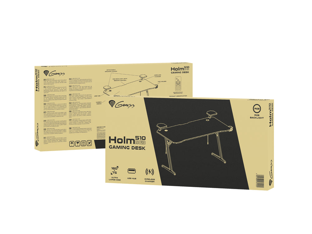 GENESIS Holm 510 RGB. Type: Lige, Form på bordplade: Rektangulær form, Bordpladens materiale: MDF. Oplader type: Ledningsført, Indgangsspænding: 5 V, USB-ladestrøm: 2 A. Bredde: 1600 mm, Dybde: 750 mm, Højde: 750 mm. Pakkevægt: 25 kg