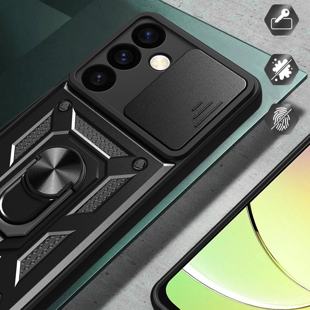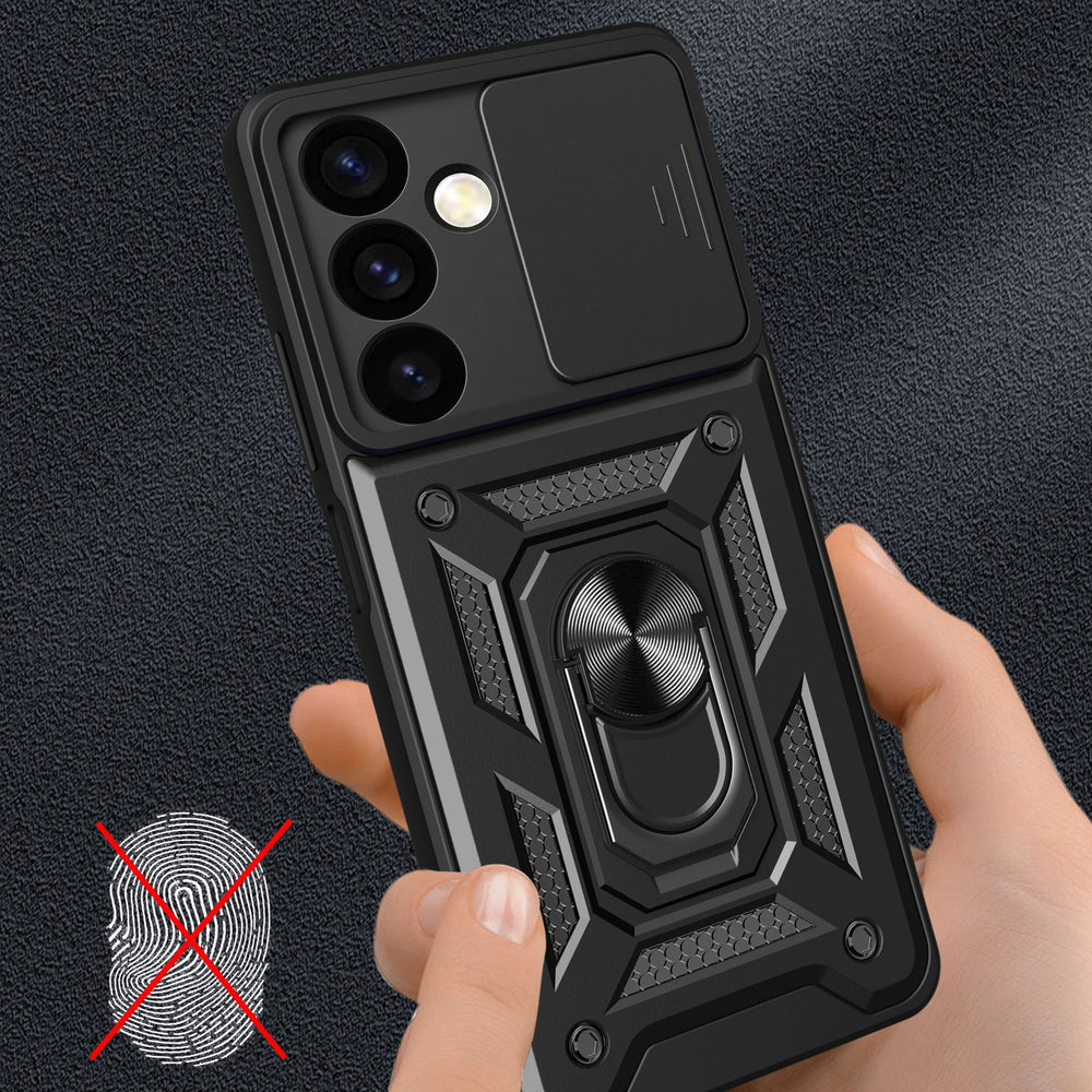 Armored case from the series Hybrid Armor Camshield is made of thermoplastic and durable material that imitates steel in appearance. The cover is fitted - it perfectly protects the phone against damage caused by falls or scratches (for example by keys carried in a pocket). The case has a sliding cover for the rear camera. Thanks to it, the camera glass is protected against scratches. There is also an additional advantage for people who value the privacy and security of their data. The covered camera prevents access to video recording if someone gains remote access to the phone and turns on the view from the main camera. Raised edges around the screen protect it from scratches when it is placed on a flat surface. It has a built-in metal ring that allows you to conveniently use the phone with one hand and also serves as a stand. The built-in metal plate allows it to be attached to magnetic car mounts. It has responsive buttons and port cutouts. Perfect for people who value style, quality and want to take care of their device.