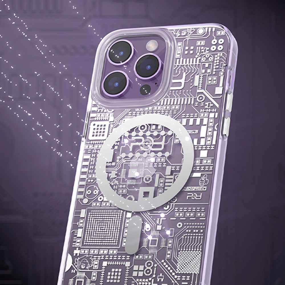 Something for a real geek! This transparent smartphone case is inspired by the texture of a printed circuit board. Made of solid plastic, effectively protects the device against the effects of falls. Supports MagSafe technology, making wireless charging possible. Metal buttons in a contrasting color make this case look very modern. The cover is adapted to the iPhone 14 , perfectly protects the phone against damage due to falls or scratches (for example, by keys carried in a pocket). Raised edges around the screen and rear camera protect the phone from scratching these elements when it is placed on a flat surface. It has responsive buttons and cutouts for ports. Perfect for people who value style, quality and want to take care of their device.