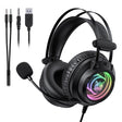 RGB backlit headphones lying next to a laptop with USB and jack cables on a dark desk