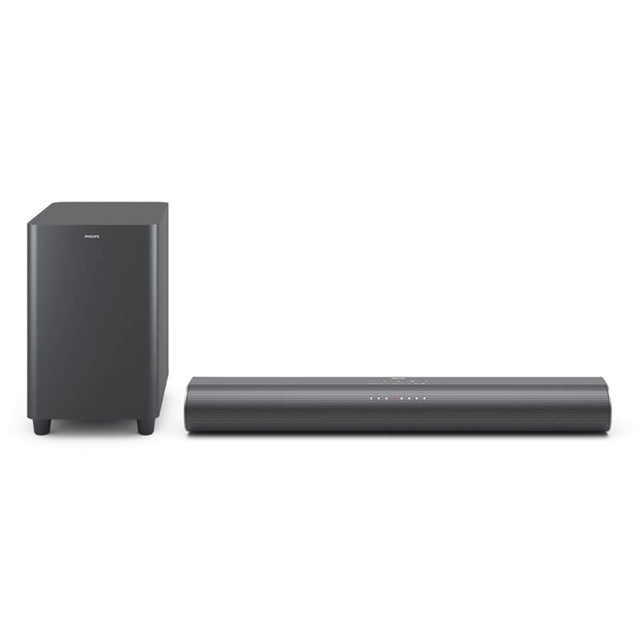 - Lydsystem: 2.1 kanaler (soundbar + trådløs subwoofer)
