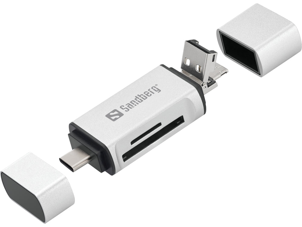 Sandberg Card Reader USB-C+USB+MicroUSB, MicroSD (TransFlash), SD, Sølv, USB, 18 g, 1 stk, 80 mm