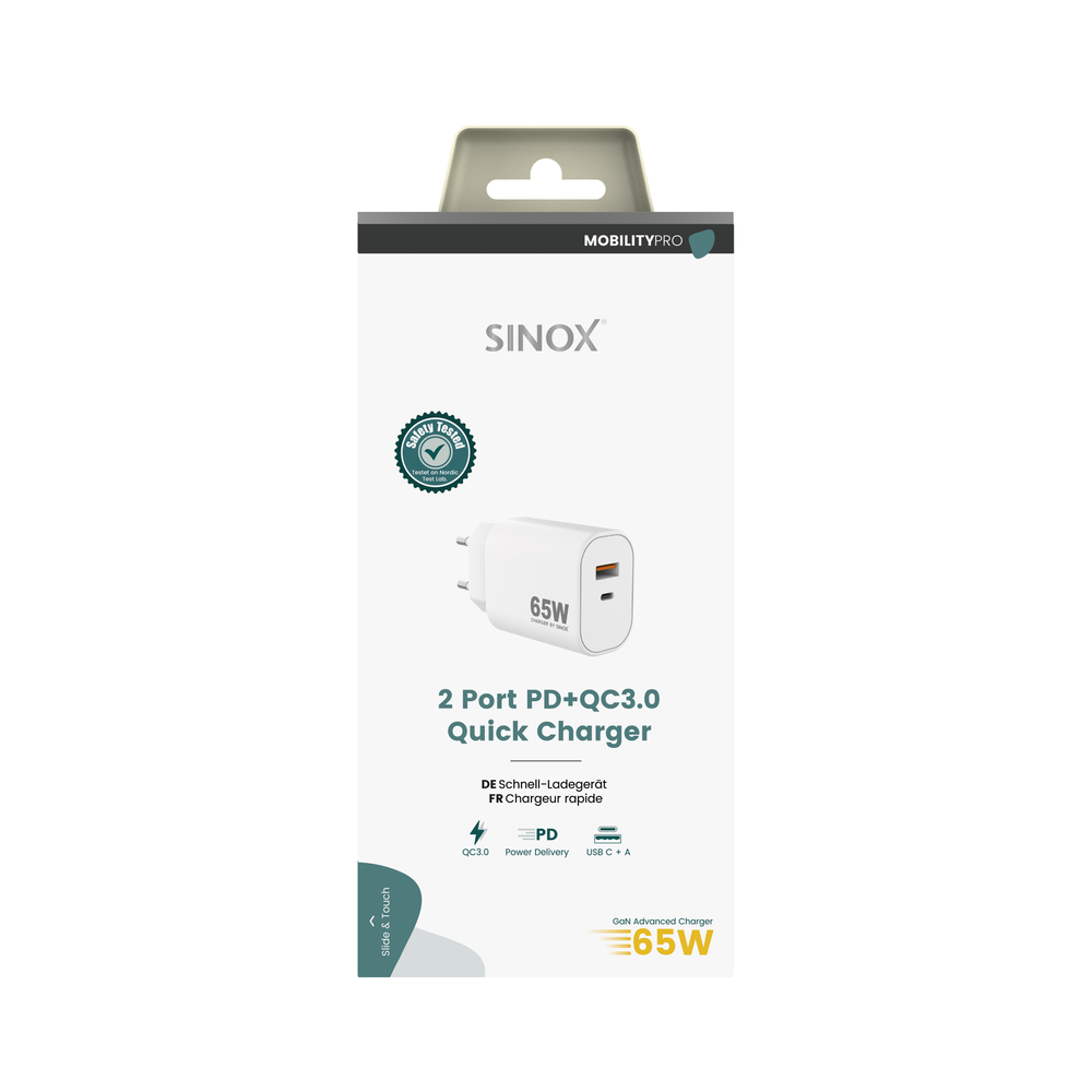 Sinox PRO 230V USB-A+USB-C PD oplader 65W. Hvid .