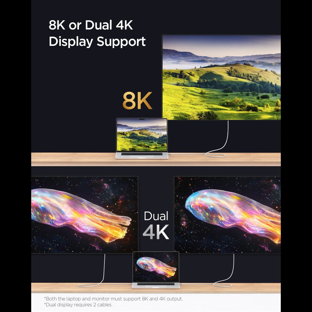 Dank der Unterstützung der Thunderbolt 3/4-Standards kann das Kabel auch anspruchsvolle Aufgaben bewältigen – es unterstützt die 8K (Single) / 4K (Dual) Videoübertragung über DisplayPort 2.0 und ist damit eine hervorragende Wahl zum Anschluss von Monitoren, Laptops oder Dockingstationen.