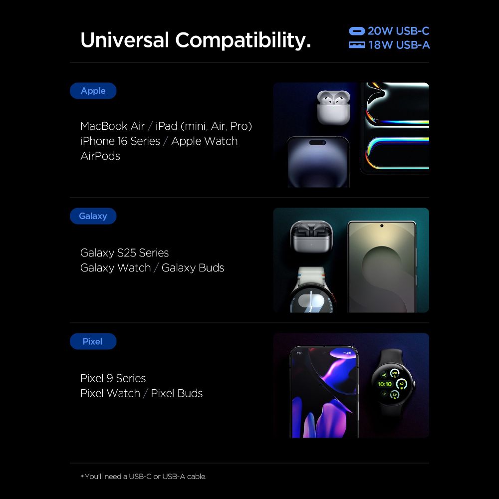 Spigen Essential EE202EU to kompaktowa, wydajna ładowarka sieciowa GaN Pro, zaprojektowana z myślą o szybkim i bezpiecznym ładowaniu dwóch urządzeń jednocześnie. Wyposażona w porty USB-C 20W oraz USB-A 18W, pozwala jednocześnie zasilać smartfony, tablety, słuchawki czy inne akcesoria, zapewniając optymalną moc dla każdego podłączonego urządzenia.