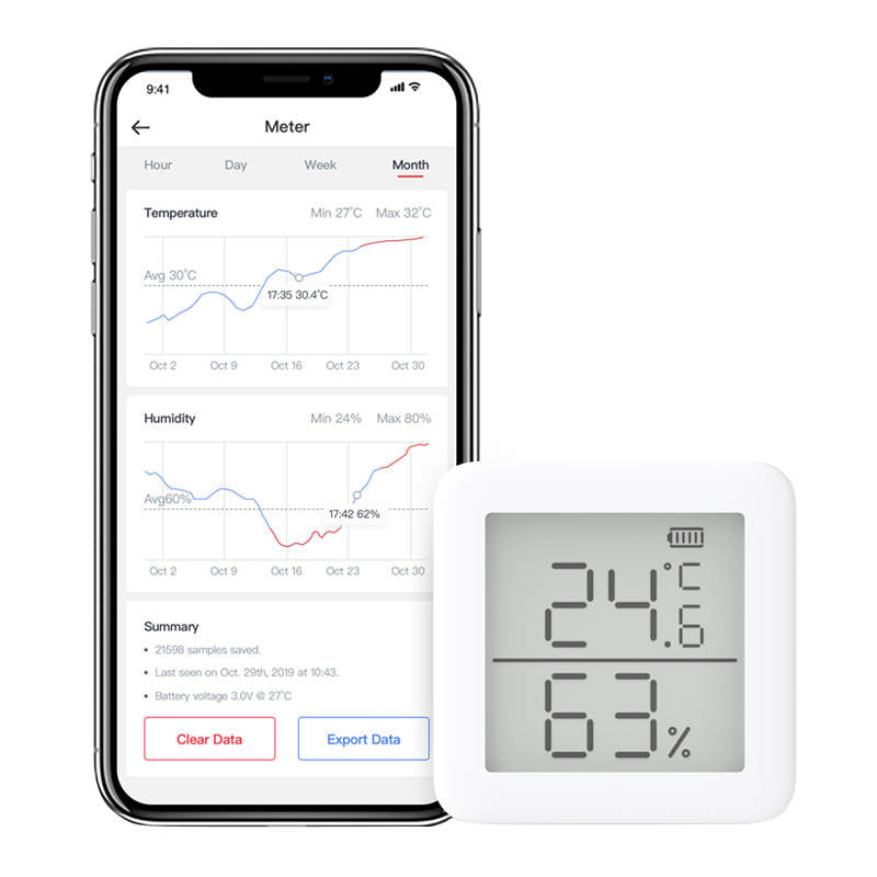 Add your device to the app and gain convenient access to your measurement history (history for the last 5 weeks or unlimited cloud storage if you use the control panel). The product connects with your phone via Bluetooth and has a range of up to 120m. You can also export data to CSV files. You will also receive special notifications. For example, if the temperature in your child's room drops below a certain level, you'll know about it immediately! Note: to use these features, the SwitchBot Hub Mini control panel is required.